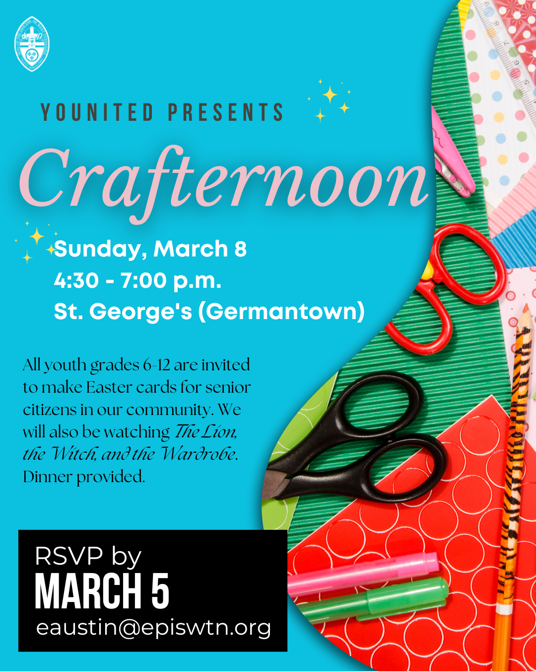 Youth will create handmade Easter cards for senior citizens in West Tennessee. These cards will be delivered ahead of Easter as a tangible sign of care and connection. In addition to our service project, we’ll share dinner together and watch The Lion, the Witch and the Wardrobe. Craft materials and dinner provided. Headcount by Wednesday, March 5: eaustin@episwtn.org.